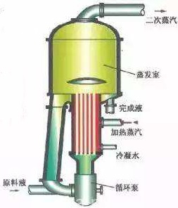 它的加熱室有臥式結構和立式結構兩種,液體循環(huán)速度大小由泵調節(jié)。根據分離室循環(huán)料液進出口的位置不同,它又可以分為正循環(huán)強制蒸發(fā)器及逆循環(huán)強制蒸發(fā)器,循環(huán)料液進口位置在出口位置上部的稱為正循環(huán),反之為逆循環(huán)。