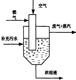 浸沒燃燒式蒸發(fā)器的主體是一個空心圓筒容器,中下部裝有被加熱液體。熱源是高溫的煙氣。將燃料(煤氣或油)和空氣混合后導入燃燒室燃燒,產(chǎn)生的高溫煙氣從浸沒于溶液中的噴嘴噴出。由于氣液兩相的溫差很大,加之氣液翻騰鼓泡,接觸充分, 故傳熱效率極高,蒸發(fā)強度很大。產(chǎn)生的二次蒸汽和燃燒尾氣從器頂?shù)臒煹琅懦?。濃縮液從器底排出。